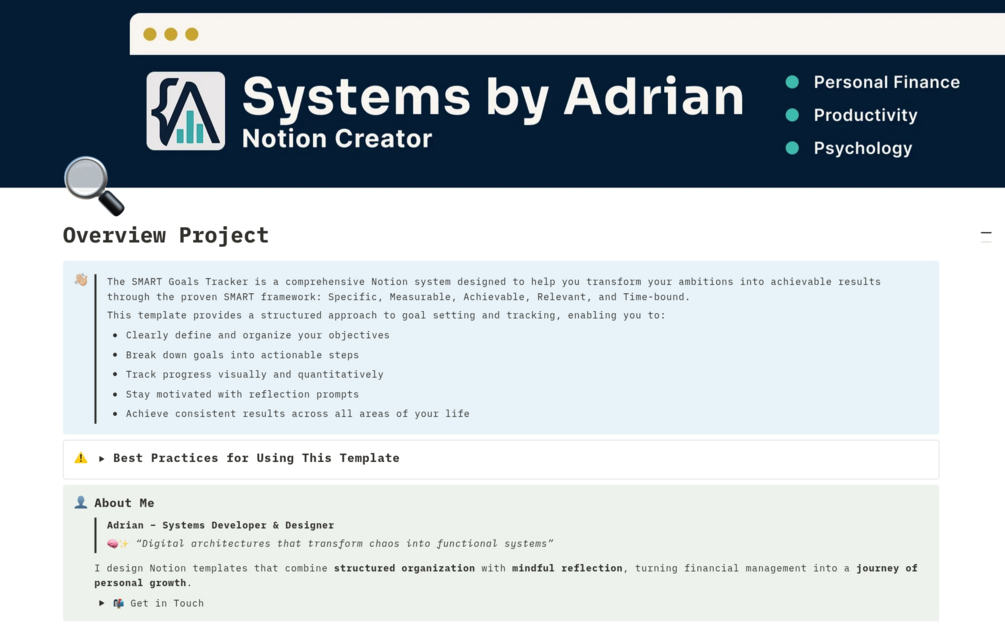 The SMART Goals Tracker is a comprehensive Notion system designed to help you transform your ambitions into achievable results through the proven SMART framework: Specific, Measurable, Achievable, Relevant, and Time-bound.
