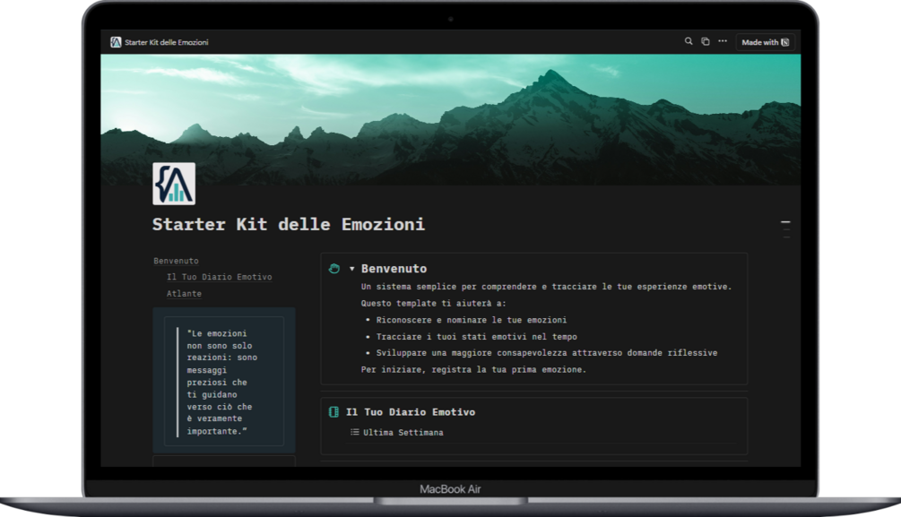 Lo Starter KIT delle Emozioni è un template Notion completo progettato per aiutarti a sviluppare una maggiore consapevolezza emotiva e applicare i framework di Goleman e Plutchik nella tua vita quotidiana. Questo template trasforma concetti teorici in strumenti pratici per il tuo benessere, permettendoti di:\n\n* Espandere il tuo vocabolario emotivo con un mini-atlante delle 8 emozioni primarie.